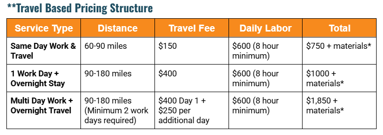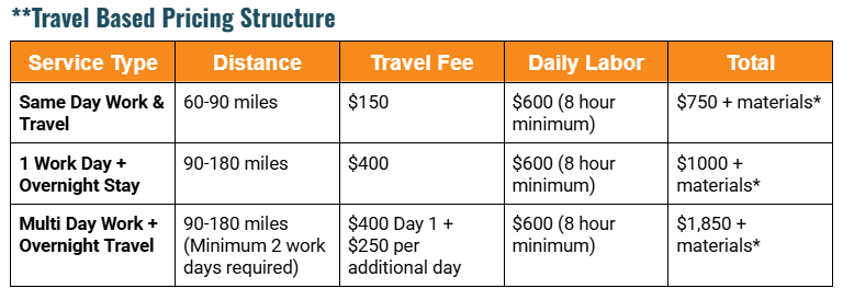 Travel fee includes drive time, fuel, and (when applicable) lodging