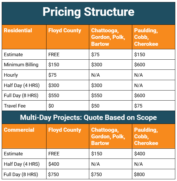 Our minimum billing requirements vary based on your distance from our home base in Floyd County, GA: